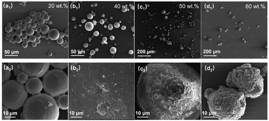 In this section, the influence of the inorganic nanoparticle content on the self-made particles was first explored. Four gradient nanoparticle contents of 20 wt.%, 40 wt.%, 50 wt.%, and 60 wt.% were chosen, and other factors were fixed to study the influence of inorganic nanoparticle content on surface structure. The content of 30 wt.%. was not investigated, as it can be observed that the surface changes from smooth to rough, and the shape changes significantly when employing the 40 wt.% to 60 wt.% content. However, the difference between 20 wt.% to 40 wt.% was not clear. Thus, the sample with 50 wt.% of nano-Al2O3 was prepared. Then, the impact of mechanical stirring speed on the self-made particles was explored to study the effect of rotating speed on the size and morphology of the particles.