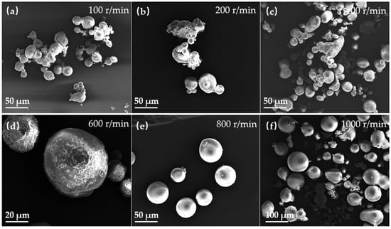To further explore the influence of mechanical stirring speed on particle morphology, the mechanical stirring speed was set at 100/200/400/600/800/1000 r/min. The results are shown in Figure 2. According to SEM images, the particles prepared at low rotational speeds would adhere to each other and could not be separated, forming massive and irregular large particles which are not suitable for dispersion, as shown in Figure 2a,b. When the rotational speed reached 400 r/min, the particles began to separate, but they were not regular enough. When the mechanical stirring speed was 600 r/min, the particles formed individual balls that no longer stuck to each other, and the surface of the particles displayed a rough structure. When the speeds reached 800 r/min and 1000 r/min, the sphere became very smooth, but the surface was too smooth, lacking the rough micro/nano structure required for the purposes of this paper.