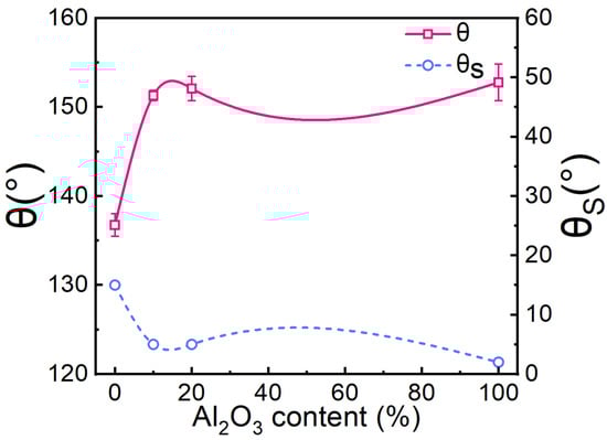 However, at the nanoscale level, according to the SEM image, it can be seen that the greater the content of inorganic nanoparticles, the more obvious the nanostructure. As shown in Figure 4d–f, the resin acts as a bonding agent. The more inorganic nanoparticles included in the sample, the coarser of the nanoscale structures. The coating with a nanoparticle content of 100 wt.% displays a large number of Al2O3 nanoparticles distributed on its surface, a nanosized microporous structure, and superhydrophobic properties. According to the fraction of inorganic nanoparticles in the total mass of all particles, the coatings were labeled as C10, C20, and C100.