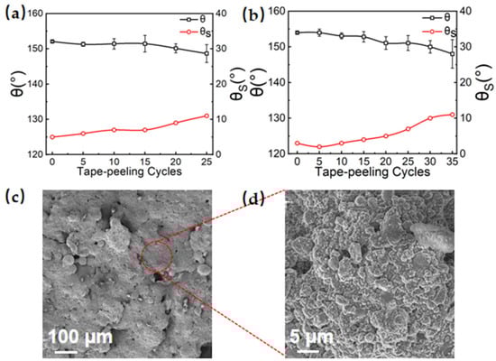 The internal adhesion ability of the tape was further tested, along with the cohesion bonding strength between particles in the coating. The test of the internal adhesion capacity was conducted using the tape-adhesion method, as illustrated in Figure 6, which presents the results of the tape tests using two types of coatings, C10 and C20. According to the test results, as shown in Figure 6a,b, these coatings performed better in terms of internal adhesion capacity, as C10 lost its ability after 25 cycles, and C20 could withstand more than 30 tests, which confirms the role of NPs in retaining superhydrophobicity.