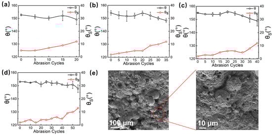 Subsequently, the surface morphology of the coating was observed by SEM after the abrasion test, and the results are shown in Figure 7e. Obvious traces of abrasion can be seen on the surface of the C20 coating after the test, and some particles showed the phenomenon of debonding and damage. In addition, the entire surface became significantly smoother than before. However, further magnification of the structure shows that the relatively obvious nanoscale structure can still be observed on the self-made particles. This indicates that the micron particles with larger sizes can protect the nanostructure, to a certain extent, during the abrasion, and the self-made particles prepared in this paper are inherently hydrophobic, which makes them conducive to the retention of the superhydrophobic properties of the coating after the abrasion.