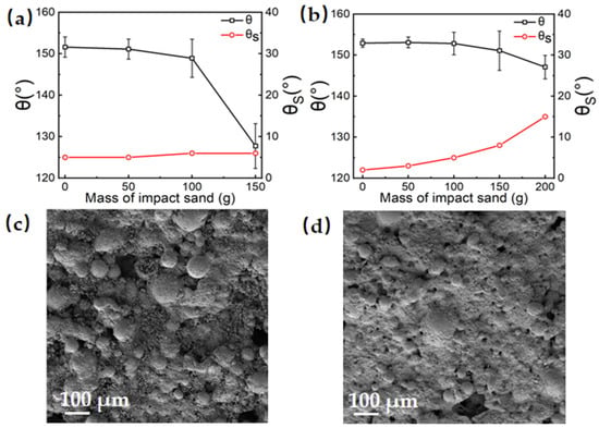 Since the coating will be damaged by solids, such as wind and sand, in the actual environment, the sand impact method is used to simulate the impact of the real environment on the coating. The sand impact test results are shown in Figure 8a,b. The results of the sand impact testing show that the C10 coating can only withstand 150 g of sand impact (50 g per impact), and the C20 coating can withstand 250 g of sand impact in the test. As illustrated in Figure 8c,d, SEM analysis indicates that the structure of the C10 coating has been broken by the impact of sand gravel, resulting in damaged columnar architecture and an abundance of debris. Furthermore, a significant number of micrometer-scale holes emerged on the surface after the roughened structure of the coating was damaged, and essentially, only self-made particles remained on the surface layer; thus, C10 lost its superhydrophobic property. The results for the C20 coating were relatively better compared to those for the C10 sample: the surface structure was still retained, along with a rough structure, but the columnar structure had been damaged, and the structure had become unidentifiable.