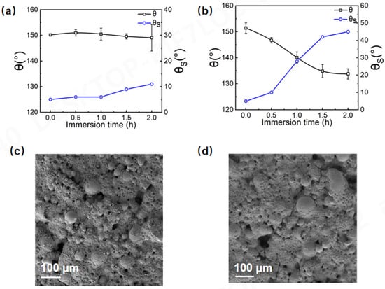 To evaluate the chemical durability of the coating, an immersion method was utilized to assess the performance of the C20 coating under strong acidic and alkaline conditions. Hydrochloric acid, with a concentration of 1 mol/L, and sodium hydroxide solution, with a concentration of 1 mol/L, were chosen to test the chemical durability of the coating. The test results are shown in Figure 9a,b. The durability of the C20 coating under acidic conditions significantly surpassed that under alkaline conditions. The hydrophobic angle merely dropped to 150° after two hours of immersion, whereas the superhydrophobicity of C20 was lost within half an hour under alkaline environments, and the hydrophobic angle rose to 45° under alkaline conditions. By analyzing the SEM images, as shown in Figure 9c,d, it can be seen that the surface of the C20 coating after strong acid immersion is slightly corroded, but it still displays a rough columnar structure, so the performance degradation is not obvious. However, after strong alkali immersion, the surface of C20 is corroded, and it loses its columnar structure, rapidly forfeiting its superhydrophobic properties. This is mainly because nano-Al2O3 can easily react with highly concentrated sodium hydroxide solutions, with a chemical mechanism of Al2O3 + 2NaOH = 2NaAlO2 + H2O. The product is soluble in water, thus triggering the loss of superhydrophobicity.