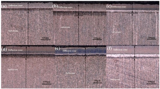 Optical micrographs of cross-sections of 1Cr17Ni2 stainless steel after nitriding under different processes. (a) 460 °C PN8h, (b) 460 °C PN16h, (c) 500 °C PN8h, (d) 500 °C PN16h, (e) 550 °C PN8h, (f) 550 °C PN16h.