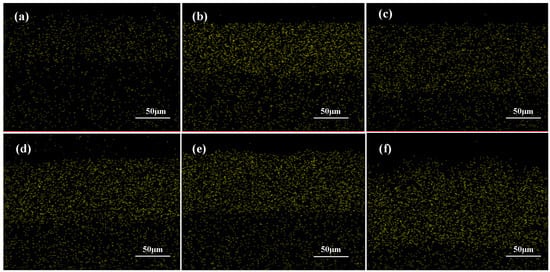 EDS surface morphology of 1Cr17Ni2 steel after nitriding. (a) 460 °C PN8h, (b) 500 °C PN8h, (c) 550 °C PN8h, (d) 460 °C PN16h, (e) 500 °C PN16h, (f) 550 °C PN16.