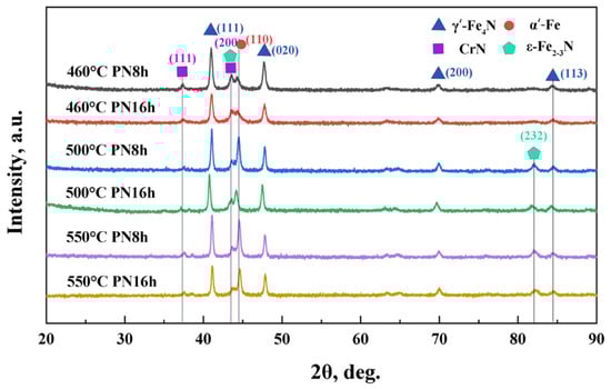 As shown in Figure 3, the XRD spectra of samples with different nitriding processes exhibit significant differences in peak intensity. During the nitriding process, the diffusion and chemical reactions of Fe, Cr, Ni, and N elements lead to changes in the surface phase composition of the samples. The nitride layer mainly consists of a compound layer and a diffusion zone. The compound layer is primarily composed of γ′-Fe4N, a small amount of ε-Fe2-3N, and CrN, while the diffusion zone is primarily composed of α′N-Fe [21,22], where N and C atoms dissolve interstitially in the α-Fe lattice. The composition of the nitride layer is the same as the phase composition obtained by Li junyang et al. for 2Cr13 martensitic stainless steel after ion nitriding [23]. γ′-Fe4N is formed due to the diffusion of N atoms into Fe during the nitriding process. It is worth noting that the diffraction peaks of the γ′-Fe4N phase show a slight shift towards lower angles, mainly due to chemical reactions and element diffusion during nitriding. On one hand, the formation of nitrides and metal compounds reduces the content of pure metal phases. On the other hand, N atoms as external interstitial atoms enter the metal, while alloying elements usually act as substituting atoms, resulting in the expansion of lattice parameters. This is consistent with the increase in equilibrium lattice constant observed in the experimental calculations in Section 3.3 of this paper. Alloying elements diffuse and interact atomically during the nitriding process, leading to the formation of metal compounds, and they play a special role in phase transformations. It is worth noting that at lower nitriding temperatures and shorter nitriding times, the peak intensity of γ′-Fe4N is higher. With an increase in nitriding temperature and extension of nitriding time, the peak intensity of γ′-Fe4N gradually weakens while the peak intensity of ε-Fe2-3N increases. This is because an increase in nitriding temperature and time leads to an increase in the concentration of N solid solution into the matrix. At the same time, the higher nitriding temperature makes the nitriding kinetics more active, which allows for a sufficient amount of N to react and form nitrides. Also, with an increase in N concentration, the reaction between γ′-Fe4N and N favors the formation of ε-Fe2-3N. Furthermore, a narrowing of the peaks is observed, indicating that the grain has grown to a certain extent, which is consistent with the observations in Figure 1. Additionally, due to the high Cr content of the 1Cr17Ni2 stainless steel, the surface phase of the sample contains CrN. The theoretical reaction products of Cr and N include CrN and Cr2N. However, only CrN is observed in the XRD pattern, which agrees with the experimental and theoretical results. According to the first-principle calculations, the energy change for the precipitation of CrN is −0.19 eV, while that of Cr2N is 9.86 eV [24]. This suggests that the precipitation of CrN can occur spontaneously, while the precipitation of Cr2N is more difficult. This also explains why CrN is preferentially precipitated in the nitriding layer on the surface of 1Cr17Ni2 stainless steel.