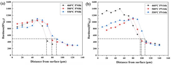 Microhardness of cross-sections of nitride specimens under different processes. (a) Microhardness after nitriding at different temperatures for 8 h. (b) Microhardness after nitriding at different temperatures for 16 h.