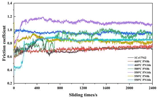 1Cr17Ni2 steel friction coefficient curves under different nitriding processes.