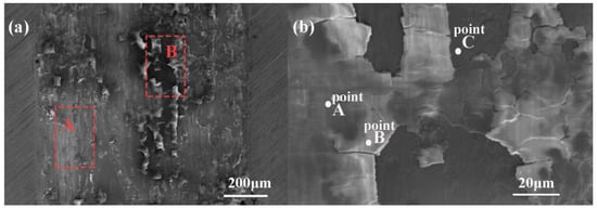 Surface morphology after friction and wear of the original sample. (a) Surface morphology (×100); (b) Surface morphology (×1000).
