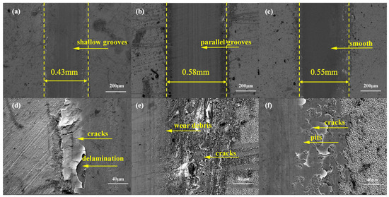 Surface wear morphology after different nitriding processes. (a) 460 °C PN8h, (b) 500 °C PN8h, (c) 550 °C PN8h, (d) 460 °C PN8h, (e) 500 °C PN8h, (f) 550 °C PN8h.