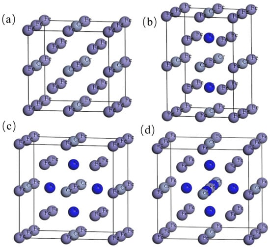 Structural schematic diagram of Fe13Cr3Nn under different nitrogen contents. (a) Fe13Cr3, (b) Fe13Cr3N2, (c) Fe13Cr3N4, (d) Fe13Cr3N6.