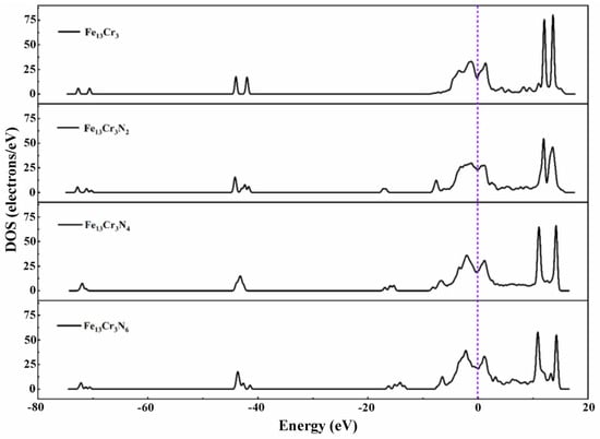 The comparison chart of total density of states for the Fe13Cr3Nn (n = 0, 2, 4, 6) series of structures is shown in Figure 12. Pseudo-gaps exist near the Fermi level for Fe13Cr3 systems with different nitrogen contents. It can be seen that the introduction of nitrogen atoms in the system causes a density of states peak at around −16 eV. The Fe13Cr3 and Fe13Cr3N2 systems in the figure show a pseudo-gap that coincides with the Fermi level. By comparison, increasing the nitrogen content causes fluctuations in the electron density near the Fermi level. M(EF) increases when two nitrogen atoms are introduced but starts to decrease when four nitrogen atoms are introduced. Moreover, the pseudo-gap peak shifts away from the Fermi level towards higher energy. This indicates that when only two nitrogen atoms are added to the system, the large lattice distortion reduces the structural symmetry, leading to a decrease in system stability. As the nitrogen content continues to increase, the symmetry of the unit cell partially recovers, but the stability of the system decreases, consistent with the previously calculated formation energy and binding energy results.