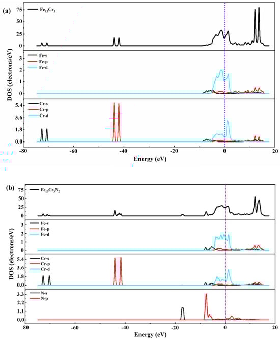 The partial density of states for Fe, Cr, and N in the Fe13Cr3Nn system is shown in Figure 13. The PDOS peaks near the Fermi level for the Fe13Cr3 alloy appear at around ±1.4 eV, with a peak value of approximately 33 e/eV. For the Fe13Cr3N2 alloy, the PDOS peaks near the Fermi level appear at around ±1.3 eV, reaching a peak value of around 30 e/eV. The PDOS peaks near the Fermi level for Fe13Cr3N4 appear at around ±2 eV, with a peak value close to 36 e/eV. For the Fe13Cr3N6 alloy, the PDOS peaks near the Fermi level appear at around ±2.1 eV, with a peak value of approximately 40 e/eV. The majority of these alloy’s PDOS peaks originate from the 3d orbitals of Fe and Cr atoms. In the Fe13Cr3Nn alloy, the peak at −72 eV mainly originates from the s orbital of Cr atoms, the peak at −43 eV mainly comes from the p orbital of Cr atoms, and the peak at −16 eV mainly originates from the s orbital of N atoms. The DOS curve at 11eV primarily originates from the p orbitals of Fe and Cr atoms. At −7 eV, there is a hybridization phenomenon between the p orbitals of N atoms and the s orbitals of Fe and Cr atoms, indicating a strong covalent interaction among Fe, Cr, and N atoms. The overlap of DOS near the −7 eV level with the Fermi level for Fe13Cr3N4 indicates a relatively stable structure. The narrowing of the DOS width for Fe13Cr3N6 suggests a decrease in covalent interaction.