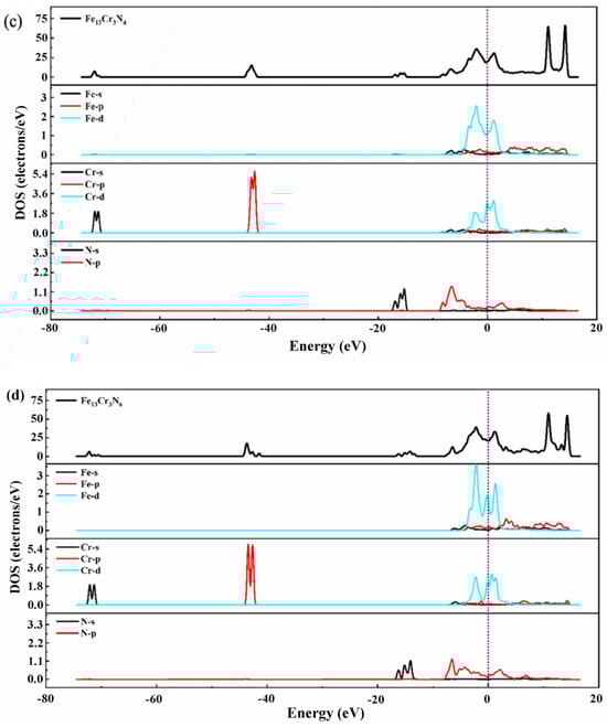 Plots of partial density of states of Fe13Cr3Nn (n = 0, 2, 4, 6). (a) Fe13Cr3, (b) Fe13Cr3N2, (c) Fe13Cr3N4, (d) Fe13Cr3N6.