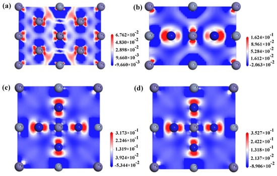 Differential charge density plot of Fe13Cr3Nn (n = 0, 2, 4, 6) structure. (a) Fe13Cr3, (b) Fe13Cr3N2, (c) Fe13Cr3N4, (d) Fe13Cr3N6.