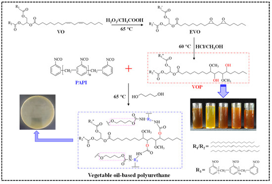 VOs, including PO, RO, OO, SO, and LO, were provided by Jiangxi Xinsen Natural Plant Oil, Co., Ltd. (Ji’an, China). 1,4-butanediol (C4H10O2, 98%, BDO) and methanol (CH3OH, 98%, MA) were obtained from Shanghai Macklin Reagent Co., Ltd. (Shanghai, China). Hydrogen peroxide (H2O2, 30%, HP), hydrochloric acid (HCl, 36%. HA), acetic acid (CH3COOH, 99.5%, AC), and sulfuric acid (H2SO4, 98%, SA) were all procured from Yangzhou Huafu Chemical (Yangzhou, China). Bayer (Leverkusen, Germany) provided polyaryl polymethylene isocyanate (PAPI, Desmodur 44V20L). Large-particle urea (with a diameter of about 2~4 mm and a percentage content of N equal to 46.6%) was procured from Hualu-hengsheng (Dezhou, China).