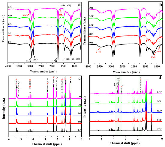 Furthermore, 1H NMR spectra of VOs showed characteristic chemical shifts for fatty acids (Figure 2c). In detail, peaks due to the olefinic protons were observed at 5.42–5.30 ppm. The methylene and methane protons of the glycerol unit were presented at about 5.27 and 4.38–4.12 ppm. The protons of methylene attached to olefin groups were presented at about 2.87–2.76 and 2.13–2.01 ppm, the protons of methylene attached to ester groups were presented at 2.36–2.28 and 1.67–1.56 ppm, and the methylene protons in fatty acid chains were presented at about 1.43–1.23 ppm, respectively. In addition, the methyl protons of ending groups were presented at about 0.93–0.84 ppm. It should be noted that peaks due to the methyl protons of linolenic acid appeared at 1.03–0.93 ppm, which are the strongest in LOP and the lowest in POP. After epoxidation and hydroxylation, the peaks attributed to olefin groups exhibited a decrease in intensity or even vanished entirely, while novel peaks emerged, as displayed in Figure 2d. The weak peaks corresponding to the protons of methoxy and methylene attached to the hydroxyl groups were observed at 3.36 and 3.60 ppm, respectively. The methane protons attached to hydroxyl groups appeared at about 3.70 ppm, and the peak intensities were significantly different owing to the type and proportion of fatty acids [29,34]. The original carbon chain structure of the VOs was not destroyed after undergoing the epoxidation/ring-opening reaction. The main carbon chain structure of VOPs was similar, and the position and number of their hydroxyl groups were determined by the type and proportion of fatty acids.