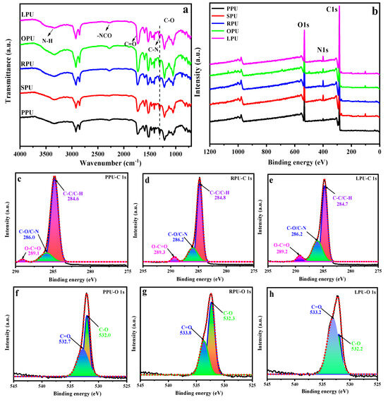ATR-FTIR (a) and XPS (b) spectra of coatings; XPS C1s (c–e) and O1s (f–h) fitting curves of PPU, RPU, and LPU, respectively.