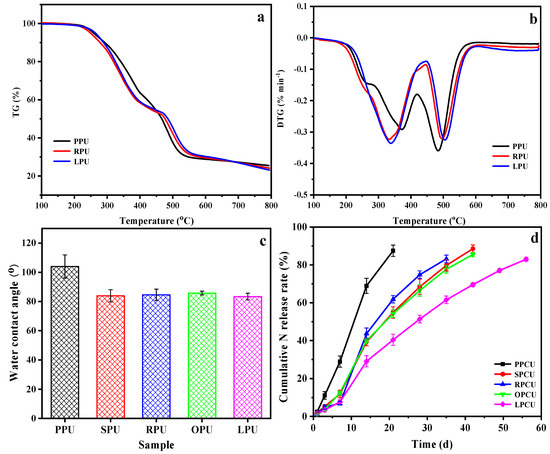 In order to compare the macro-properties of the coatings, TGA, WCA, and nitrogen release behavior were measured. The thermal stability of three typical coatings was detected using TG/DTG, and the findings are presented in Figure 5a,b and Table S3 (in the Supplementary File). The main difference for the three coatings was that there was an obvious weight loss of PPU and RPU at 170~250 °C, implying the existence of easily decomposable small molecules. The 5% mass losses of PPU, RPU, and LPU occurred at 257 °C, 262 °C, and 264 °C, respectively. The thermal degradation at 250~450 °C was attributed to the decomposition of urethane bonds into isocyanates and polyols, leading to the formation of amines, carbon dioxide, and other small molecules. Notably, at this stage, the weight loss of PPU was lower than that of other samples. This is because the content of urethane bonds in PPU was less than in other coatings due to the low hydroxyl value and functionality of POP. Finally, the thermal degradation at 450~550 °C was attributed to the dissociation of isocyanate and polyol molecules [37]. At this stage, the weight loss of three samples was in the order of PPU > RPU > LPU; the maximum thermal weight loss rates of PPU, RPU, and LPU occurred at 484 °C, 502 °C, and 500 °C, respectively; the residual weights were all around 24%, indicating that the thermal stability of LPU exceeded that of other samples, implying its excellent cross-linking density.