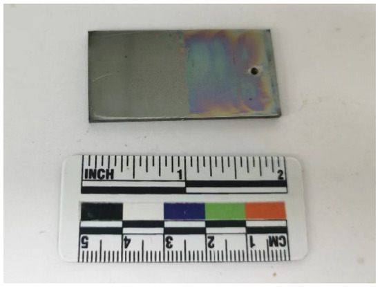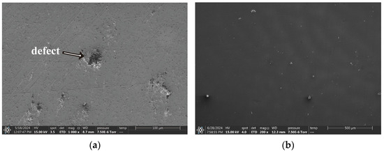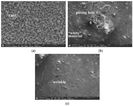 - Regarding the B72 sealing material itself, the sealing coating had a good protective effect on the metal artifacts in the initial stage. Both Rp and impedance modulus or Rn and Zn were higher than that of the blank group, which indicated that B72 had a good inhibition of corrosion but almost lost its effect after a short period (2–3 d) of immersion in a 3.5 wt% NaCl solution. σV decreased while σI increased, indicating that the coating became poorly protective. Electrochemical parameters and morphology observation showed that the B72 material itself had poor water resistance. B72 gradually lost its bond with the substrate when exposed to water. The corrosion generated by the pitting holes destroyed the film and led to the development of corrosion (Figure 15b), and the corrosion proceeded slowly even under an intact film layer (Figure 16). In practical applications, it is necessary to keep the surface to be sealed dry and free of water, and the subsequent preservation needs to control the humidity to avoid the formation of liquid film or liquid droplets on the surface of the object when the humidity is too high.