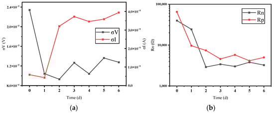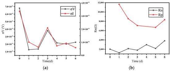 - In the time domain analysis, the σI showed a gradual decrease in the corrosion rate in the blank group and a gradual increase in the corrosion rate in the B72 group, which was consistent with the macroscopic recognition of corrosion. Meanwhile, the noise resistance Rn and polarization resistance Rp showed consistency in trend although they were not exactly the same in value.