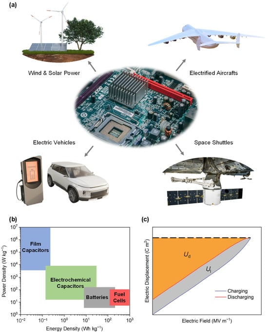 (a) Applications of dielectric energy storage capacitors in areas of wind and solar power, electric vehicles, electrified aircrafts, and space shuttles. (b) Comparison of power density and energy density among energy storage devices including film capacitors, batteries, electrochemical capacitors, and fuel cells. (c) Scheme of charging (blue line) and discharging (red line) processes in dielectric energy storage capacitors, in which the gray area represents energy loss Ul and the orange area represents Ud.