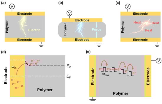 Schematic of (a) electronic breakdown, (b) electromechanical breakdown, (c) thermal breakdown, (d) charge injection (representative of the Schottky injection), and (e) charge migration (representative of the hopping conduction) processes.