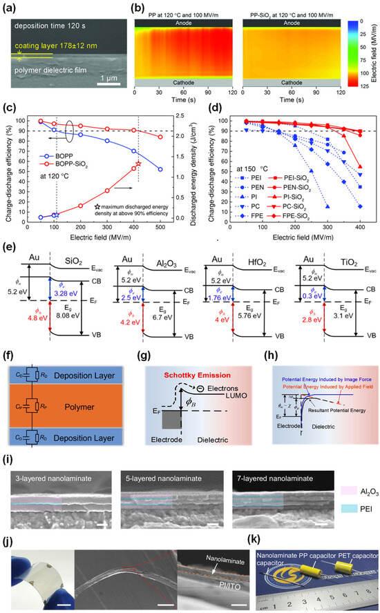 (a) Cross-sectional SEM image displaying the coating layers on a polymer film. (b) Electric field distortion in both uncoated PP and SiO2-coated PP films, as measured by the pulsed electroacoustic (PEA) method at 120 °C and 100 MV·m−1. (c) η and Ud of BOPP and BOPP-SiO2 films with 180 nm coatings on both sides, evaluated at 120 °C. (d) η of different dielectric films before and after coating, tested at 150 °C (reused with permission, [73] © 2018, WILEY-VCH Verlag GmbH & Co. KGaA). (e) Energy band diagrams showing the interfaces between metal electrodes and various deposited layers. (f) Diagram illustrating the sandwich structure and corresponding equivalent circuit. (g) Schematic of Schottky emission, where ϕB represents the electron potential barrier and LUMO denotes the lowest unoccupied molecular orbital. (h) Energy diagram illustrating the reduction in potential barrier due to image forces and applied electric fields (reused with permission, [76] © 2021, Elsevier). (i) Cross-sectional SEM images of nanolaminates with varying layer counts and 10 nm PEI interlayers. Pink areas represent Al2O3, and blue areas represent PEI. The scale bar is 50 nm in all images. (j) Optical photograph (left) of a 7-layer nanolaminate on a flexible substrate, with cross-sectional SEM images showing the nanolaminate under bending (middle) and a magnified view (right). The scale bar is 1 cm for the left image, 400 μm for the middle, and 200 nm for the right. (k) Schematic of a metal wire-based nanolaminate capacitor, with an optical photograph comparing it to commercial metalized PP and PET capacitors (reused with permission, [74] © 2021, Elsevier).