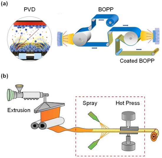 Schematic of physical methods including (a) PVD (reused with permission, [80] © 2022 John Wiley & Sons Australia, Ltd.; [81] © 2019, Elsevier) and (b) spraying and hot pressing (reused with permission, [82] © 2020, Elsevier) methods for deposition.