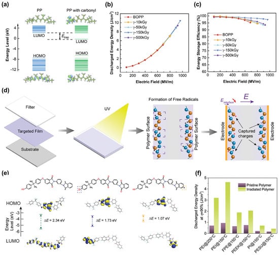 - Wang, Y.; Bao, Z.; Ding, S.; Jia, J.; Dai, Z.; Li, Y.; Shen, S.; Chu, S.; Yin, Y.; Li, X. γ-Ray Irradiation Significantly Enhances Capacitive Energy Storage Performance of Polymer Dielectric Films. Adv. Mater. 2024, 36, 2308597. [Google Scholar] [CrossRef]