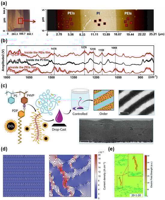 (a) Schematic diagram of AFM-IR technology. (b) Optical image of the cross-section of the sandwiched film and the area selected for characterization (reused with permission, [120] © 2022, Elsevier). (c) Schematic of the fabrication of PS-b-P4VP(PDP)/ZrO2 NP supramolecular nanocomposites. (d) Simulated leakage current distributions of the ordered and disordered PS-b-P4VP(PDP) nanocomposites with 9 vol% ZrO2 NPs under an applied electric field of 200 MV m−1 (reused with permission, [62] © 2024, John Wiley & Sons). (e) The incomplete breakdown in sandwich BaTiO3/PVDF nanocomposites at the applied voltage of 9 kV simulated using the finite element method (reused with permission, [121] © 2024, John Wiley & Sons).