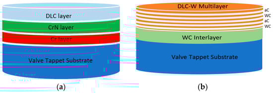 - Takeno, T.; Sugawara, T.; Miki, H.; Takagi, T. Deposition of DLC film with adhesive W-DLC layer on stainless steel and its tribological properties. Diam. Relat. Mater. 2009, 18, 1023–1027. [Google Scholar] [CrossRef]
