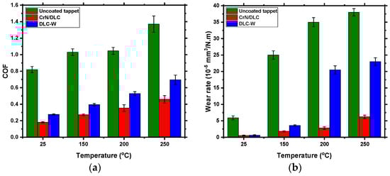 - The CrN/DLC coating showed the lowest wear rates during the sliding reciprocating tests at 25 °C. Increasing the testing temperature leads to an increase in friction coefficient. However, CrN/DLC COFs remained the lowest compared to DLC-W and uncoated valve tappet at all temperatures.