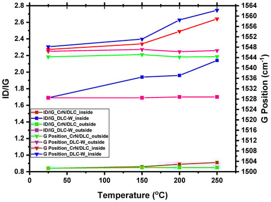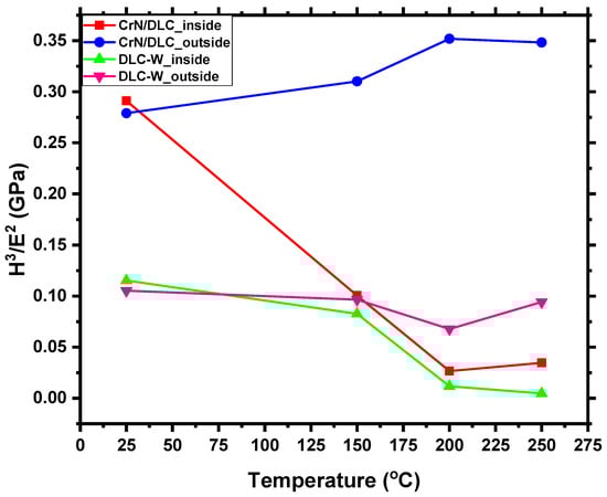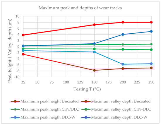 - The DLC-W coating showed low wear rates at 25 °C and 150 °C. However, at 200 °C and 250 °C, the wear rate strongly increased due to the total removal of the coatings from the substrate, thereby exposing the tappet valve to direct contact with the sliding ball.