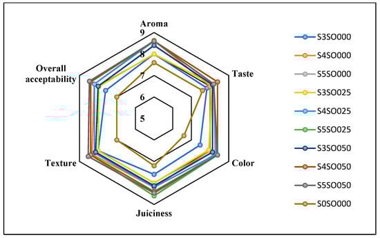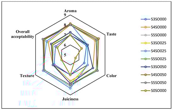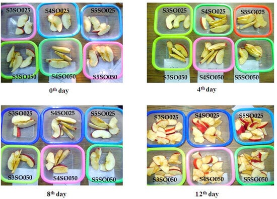 During storage for 12 days, all samples, including the control, showed an increasing pH trend (Table 2), between 4.226 and 4.941. A drop in titrable acidity may correlate with a rise in pH. The starch coating on the apple slices may have changed the endogenous CO2 and O2 concentrations, which led to the utilization of organic acid as a respiration substrate and an elevation in pH []. Similar findings were observed by [] for fresh-cut pineapples coated with honey and soy protein isolate-based coatings. Increased pH has been associated with a decrease in malic acid due to increased respiration rate after peeling and cutting. The increase in pH was found to be more pronounced in coated samples than in control, probably due to less dependence on organic acids for respiration in control samples, which further strengthens the above-cited factor. This result showed that the changes in pH during storage and the effects of different coating treatments were different. The storage effect was significant at both the 5% and 1% confidence levels, according to the ANOVA results but, for sample S3SO025 storage days 4 and 8, for sample S4SO025 storage days 4 and 8, for sample S4SO050 storage days 8 and 12, and control sample S0SO000 storage days 4 and 8, the results seemed to show no significant differences between them. Additionally, it was demonstrated that the combined effect of all independent parameters, oil–sago, oil-storage duration, sago-storage period, and combinations of these sources, was significant at both confidence levels. Because starches have better gas barrier properties than oil [,], they have a relatively more pronounced effect on the modified internal atmosphere at the cellular level. This is likely to be why the effect of sago concentration has a higher F value than that of oil.