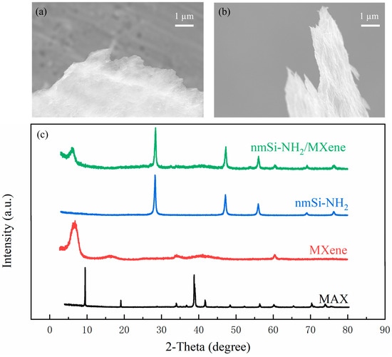 Figure 2. SEM images of (a,b) Ti3C2TX. (c) XRD spectra of MAX, MXene, nmSi-NH2, and self-assembly nmSi-NH2/MXene.
