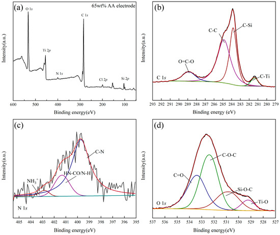 The surface chemical composition of AA electrodes was analyzed using X-ray photoelectron spectroscopy (XPS). The XPS spectrum of 65 wt% AA electrode in Figure 4a shows sharp peaks at 284.7 eV, 454.5 eV, and 532.7 eV, corresponding to elemental C, Ti, and O, respectively. After Gaussian fitting the C 1s spectrum, peaks were identified at 288.8 eV (O=C–O), 284.88 eV (C–C), 283.8 eV (C–Si), and 281.4 eV (C–Ti), as shown in Figure 4b [25,26,27]. The C-Si bond peak confirms the successful assembly of Si with MXene sheets, and the whole C-Ti peak at 281.4 eV indicates the presence of MXene [28]. Additionally, the detection of C-Si bonds in the C 1s spectrum also confirms successful amino functionalization.