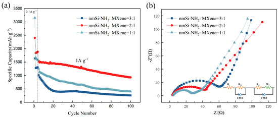 Figure 7. (a) Cyclic performance of electrodes with three different ratios at the current density of 1 A g−1; (b) EIS curves of these three electrodes.