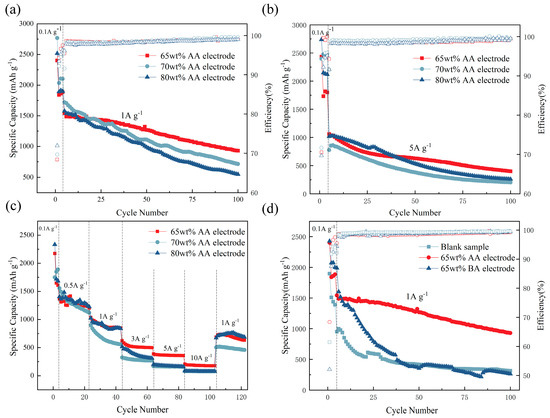 Figure 8. Cyclic performance of 65%/70%/80%wt% AA electrode at the current density of (a) 1 A g−1 and (b) 5 A g−1; (c) rate performance of 65%/70%/80%wt% AA electrode; (d) comparison among BA, AA electrode and blank sample.