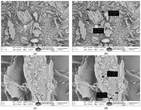 The BC-PWS comes from the company Control y Controles Industriales LTDA in Bucaramanga. The biomass (PWS, Figure 1a) was transformed into BC-PWS (Figure 1b) in a furnace (pyrolysis) with a production capacity of 500 kg/h. The residence time in the furnace was 20 min and the temperature was 450 °C. The BC-PWS was crushed in a laboratory mill to obtain particles smaller than 0.075 mm (passing sieve #200). Using a scanning electron microscope (SEM) type JEOL JSM-6700F, the particles were observed (between 500 and 10,000 magnifications; Figure 2a–d), their shape was evaluated, and porosity (diameter), dimensions, and elemental chemical composition were measured. The maximum size of the amorphous particles of BC-PWS varied between 20 and 70 µm, and they presented porous surface texture (pores with average diameter varying between 250 and 800 nm) and roughness. The elemental chemical composition is shown in Table 3. In the visualizations of the PWS, two types of particles were the most common (referred to as PWS1 and PWS2), with one being more carbonaceous and the other containing biomass that did not fully carbonize and retained some elements of its base composition. The BC-PWS shows high chemical compatibility with AC as it is a carbonaceous material.