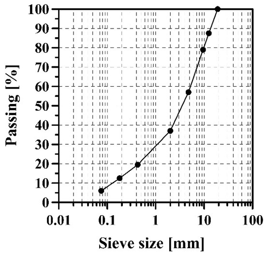 The design of the control (BC/AC = 0%) and modified (BC/AC = 10%) HMA mixes was conducted following the guidelines established by AASHTO T-245. The optimum asphalt content (OAC) was obtained according to the criteria established by [50,51] for HMA with gradation and a maximum nominal aggregate size of 19 mm (Figure 3). Twelve Marshall-type cylindrical samples per HMA type (three for each asphalt content of 4.5, 5.0, 5.5, and 6.0%) were compacted at 75 blows per face to obtain the air voids in the mix (Va), voids filled with asphalt (VFA), voids in mineral aggregates (VMA), stability (S), flow (F), and S/F ratio. S and F were measured on samples conditioned at 60 °C while applying a monotonic load in the Marshall press with a displacement rate of 50 ± 5mm/min. The compaction and mixing temperatures to make each Marshall sample (280 ± 30 cP and 170 ± 20 cP, respectively) were 145 ± 5 °C and 150 ± 3 °C, respectively. For the modified HMA, these temperatures were not changed (despite requiring an approximate increase between 5 and 10 °C) so as not to affect the environment, and age and prematurely stiffen the binder [54].