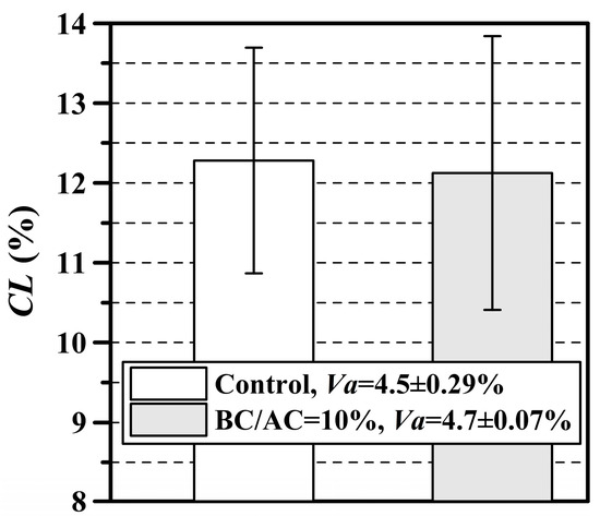 The ITSD, ITSC, and CL parameters obtained from the ITS and Cantabro test correlate with aspects associated with the durability, adhesion, cohesion, abrasion resistance, and raveling of the mixes. On the other hand, the TSR parameter is used to evaluate resistance to moisture damage. The results of the ITS and Cantabro test are presented in Figure 6 and Figure 7, respectively. The BC-PWS contributes to increasing the ITSD and ITSC parameters. The modified HMA mixture exhibits a 13.3 and 20.3% increase in these parameters over the control HMA mixture, and both increases were statistically significant (FT = 8.53 > F0.05 = 7.71 for ITSD y FT = 60.7 > F0.05 = 7.71 for ITSC). That is, BC-PWS helped to improve the indirect tensile strength of HMA in dry and wet states. This is consistent with the TSR values = 75.6% and 80.2% of the control and modified HMA, respectively. It is important to mention that the control HMA does not meet the minimum value of TSR = 80% recommended by [50,51]; the opposite case occurs with the modified HMA, which does meet this requirement. In summary, BC-PWS helps to improve the adhesion of the AC with the aggregates (in both dry and wet states) and contributes to increasing the resistance to moisture damage. These results are like those reported with other types of BC [27,59,62]. On the other hand, modified HMA generated a slight decrease in CL. However, this decrease was not statistically significant with respect to the control mixture (FT = 0.015 < F0.05 = 7.71). In other words, the Cantabro abrasion and raveling resistance of both mixtures is similar (BC-PWS did not help to significantly decrease the CL).