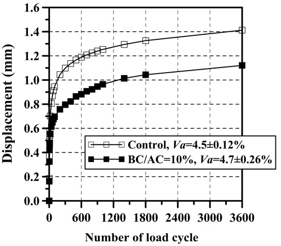 The RM values and permanent deformation test results of the control and modified HMA are presented in Figure 8 and Figure 9, respectively. The BC-PWS contributes to increasing the RM of the HMA. The approximate increase in stiffness of the modified HMA over the control HMA was 17.0 ± 2.3%, 19.2 ± 1.4%, and 19.9 ± 0.8% for temperatures of 10, 20, and 30 °C, respectively. This increase in the RM of the modified mixtures was statistically significant (FT > F0.05; Table 6) generating an increase in the resistance to permanent deformation (Figure 9). At 3600 cycles of loading (7600 s), the control HMA showed a 0.29 mm higher displacement compared to the modified HMA, and this was statistically significant (FT = 8.45 > F0.05 = 7.71). Additionally, the displacement rate measured between 1800 and 3600 s of loading was 48 × 10−6 and 42.8 × 10−6 mm/cycle for the control and modified HMA, respectively. That is, the BC-PWS contributes to increasing the stiffness under cyclic loading and rutting resistance of the HMA. These results agree with the increase in stiffness of AC with BC-PWS observed in softening point, penetration, viscosity, and rheology tests (Figure 4 and Table 4). They also correlate with the results found in the reference literature using other types of BC (e.g., [27,28,62,63,64]), with the S/F ratio of the Marshall test, and with the results of the ITS test (the stiffness of the mixtures tends to increase with the increase in ITS) [65]. In addition, the amorphous geometry and rough and porous surface texture of BC-PWS contributed to the strengthening of the binder microstructure, increasing the cohesion of the HMA [38,62] and of the asphalt mastic [66].