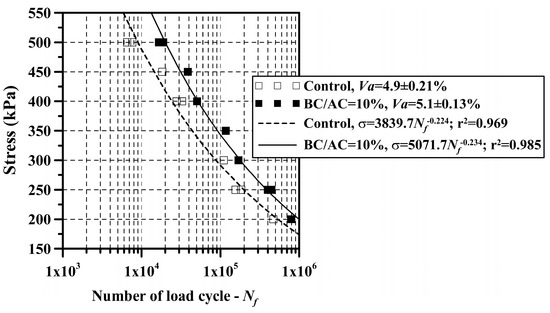 The curves showing the fatigue results under stress-controlled mode are shown in Figure 10. The parameters a, b, σ5, σ6, and σ7 obtained from these curves using Equation (2) are shown in Table 7. The higher fatigue resistance is exhibited by the modified HMA (exhibits higher values of a, σ5, σ6, and σ7 and similar magnitude of b with respect to the control HMA). This is due to the higher stiffness of the BC-PWS modified binder and to the increase in the ITSD, ITSC, and RM parameters of the HMA due to the presence of this biochar. Generally, HMAs exhibit greater fatigue resistance under stress-controlled conditions when both ITS and RM increase [65,67,68,69,70].