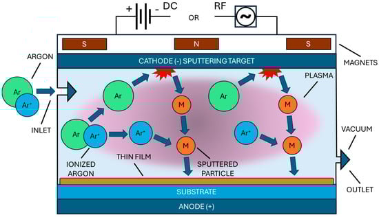 Despite not being the scope of this work, the fundamentals of the magnetron sputtering methodology can be briefly outlined. Magnetron sputtering is a sophisticated physical vapor deposition (PVD) technique widely used for producing thin films with precise control over their composition, thickness, and microstructure. The process takes place within a vacuum chamber at low pressure, where a target material (cathode) is bombarded by high-energy ions, typically generated from an inert gas like argon. A magnetic field is applied in the vicinity of the target, which traps the electrons and increases plasma density near the target, enhancing the efficiency of the sputtering process. As the argon ions collide with the target, atoms are ejected from its surface. The sputtered neutral particles, atoms, groups of atoms or even molecules, are propelled through the vacuum chamber in a straight line until they interact with some other particle or a surface. When the interaction with the surface of the substrate occurs, it condenses, and a thin film grows. The use of a magnetic field differentiates magnetron sputtering from traditional sputtering, offering a higher control over the deposition rate and consequently of the films’ properties. Figure 1 depicts the process of thin films deposition through magnetron sputtering [56].