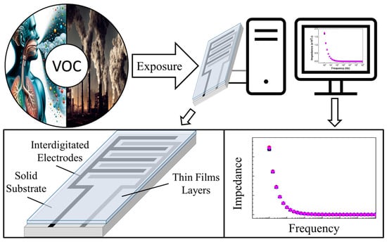 Once the production procedure has finalized, the sensors are exposed to the target compounds and the variation of a specific parameter is assessed during that exposure. One of the most common parameters evaluated during the experiment is impedance. The sensors are assembled in the interior of a dedicated vacuum chamber of a system of impedance spectroscopy, and the impedance variance of the thin films during the interaction with the volatile compounds is registered. Not being the scope of this work, detailed information on the working principle of the sensors can be found elsewhere [29,61]; nonetheless, a summarized schematic is included in Figure 2, where the exposure of the gas sensors developed through magnetron sputtering to generic VOCs and the assessment of the impedance variation can be seen.