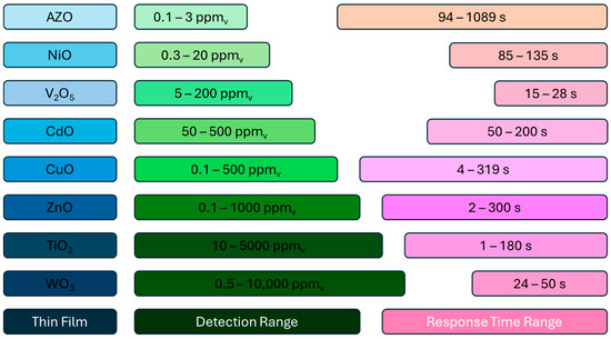 The magnetron sputtering technique was the technique equally used by Wongrat et al. (2023) to explore the impacts of Cu and Ni in the sensing performance of ZnO-based thin films. To do so, the authors sputtered these elements on top of the thin films of zinc oxide prepared by a direct current heating technique and exposed the sensors to known concentrations of butanol (1000 ppmv). In both scenarios, the sensors proved to be fully capable of detecting the samples at optimal sensing temperatures ranging between 400 and 450 °C and exhibited response and recovery times ranging from 3 to 4 and from 208 to 747 s, respectively [101].