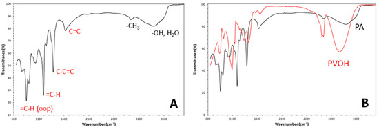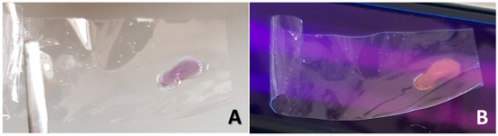 At the beginning of the chemical dehydration process, the PVOH films turned a purple color, which was slightly fluorescent and characterized by a white emission when observed under the UV light of a mercury vapor lamp (TLC lamp, short wave: 254 nm) (see Figure 2A,B). Such a visible coloration/fluorescence phenomenon, which decreased and then disappeared with the progression of the PVOH conversion into PA, has been already described in the literature for thermally dehydrated PVOH films [12]. The visible coloration/fluorescence of partially reduced PVOH could be ascribed to the initial formation of short chains of conjugated carbon–carbon double bonds (i.e., dienes, trienes, etc.). The final polymeric sample was a rubbery black solid with a density higher than that of water (relative density: 1.2). The dry reaction product (deposited on a paper substrate) was found to be electrically conductive and behaved like a highly resistive material (ca. 287.0 ± 0.7 kΩ/sq. at 1 kHz), as measured by an LCR meter.