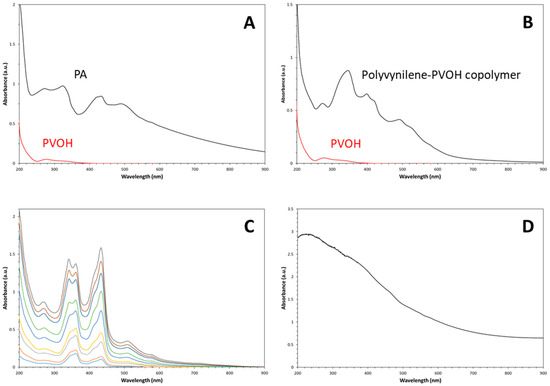 Polyenes obtained by reacting PVOH with H2SO4 aqueous solutions (e.g., 50% by volume of H2SO4) showed a rather similar UV–Vis spectrum (see Figure 4B). Owing to the different dehydration conditions, the absorption maxima were distributed differently. The temporal evolution of the optical spectrum of the liquid phase during the chemical dehydration reaction using H2SO4 at room temperature is shown in Figure 4C; these spectra were acquired at time intervals of 15 min. According to the distribution of peak intensities in the spectra shown in Figure 4A–C, highly conjugated carbon–carbon double bonds were much more abundant in PVOH films treated with H2SO4 compared to those in samples subjected to dehydration with a concentrated H2SO4 aqueous solution (50% by volume of H2SO4). The optical spectrum of the purified PA solid film is shown in Figure 4D. As it can be observed, the absorbance spectrum showed a continuum absorption band, covering half of the visible spectral region, and was characterized by a barely visible fine structure.