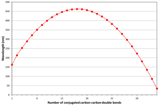 where λmax is the wavelength of the electronic absorption band maximum and n is the number of conjugated carbon–carbon double bonds contained in the copolymer blocks. Indeed, the PVOH blocks present along the linear copolymer molecules did not contribute to the electronic spectrum, because they had only n→σ* and σ→σ* electronic transitions that fell outside the experimentally measured ultraviolet spectral region (i.e., below 190 nm). Only the various polyene families in the copolymer chains, which are characterized by different lengths, may contribute to the optical spectrum. In particular, the above mathematical law predicts an increase in the wavelengths of absorption maxima of polyene bands up to 14 conjugated carbon–carbon double bonds and then a decrease in the absorption band maximum wavelength. In particular, with the increase in polyene block extension (n) from one to 14, the band moves from the ultraviolet spectral region (UV–A) to the middle of the visible spectral region, while it comes back to the blue region and then to the ultraviolet spectral region with further increases in the polyene block extension (i.e., n > 14). A graphical representation of the absorption band wavelength vs. the number of carbon–carbon double bonds present in each polyene unit is given in Figure 5.